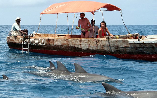 This full day guided excursion begins at 9h00 when you are picked up from your  hotel and transferred by minibus to the fishing village of Fumba, 18 kilometres  away. Here you will be provided with a life jacket demonstration followed by a  briefing on the days excursion. You will then board the dhows and set off in  search of the dolphins (85% chances). The species frequently found at Menai bay  are spinner and bottlenose dolphins. You will swim with dolphins if they stay  close to the boat, but are unlikely to be able to touch the dolphins as they  are of course wild animals.